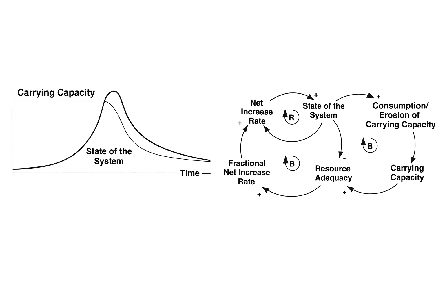 این متن یکی از کهن الگوهای (Archetype) مهم در پویایی سیستم را معرفی می‌کند. این الگو «افزایش بیش از حد و فروپاشی»، overshoot & collapse هست. همچنین در ادامه از نمونه‌های این الگو در جهان واقع مواردی می‌آورد.