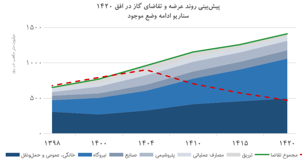 نمودار این پست، روند عرضه و تقاضای گاز رو از سال ۱۳۹۸ تا ۱۴۲۰ نشون میده ( موسسه آموزش و پژوهش مدیریت و برنامهریزی، ۱۴۰۱).